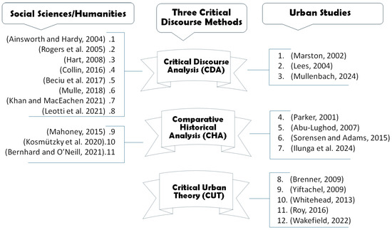 This section examines three established critical analytical approaches in the social sciences: critical discourse analysis (CDA), comparative historical analysis (CHA), and critical urban theory (CUT). Critical discourse analysis (CDA) focuses on the power dynamics within discourse, offering tools to analyze how language constructs and perpetuates social hierarchies [85,115,116,117]. CHA examines causal mechanisms and historical trajectories to understand how past events shape present societal structures [45,46,54]. Critical urban theory (CUT) expands the analytical scope by critiquing depoliticized interpretations of urbanization. It emphasizes the interplay between historical legacies, socio-political contexts, urban governance, and spatial practices [47,48,49]. CUT interrogates the historical foundations of neoliberal urban policies and the role of global capital in shaping cities, while advocating for social justice in urban research and praxis [95,96]. While CDA and CHA provide structured methodologies for dissecting discourses and historical processes, CUT offers a theoretical perspective for critiquing socio-political forces in urban environments. By drawing on insights from CDA (e.g., language–power dynamics) and CHA (e.g., historical causation), CUT enriches urban analysis by connecting historical narratives, socio-political contexts, and spatial realities.