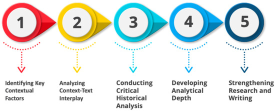 Historical contextualization concerns placing an event or phenomenon within its broader historical and societal problems. This approach uncovers the connection between the issue and its time. One must understand the historical context to effectively contextualize events, societal norms, technological advancements, and geographic factors. This approach emphasizes analyzing the subject’s background and purpose and the societal conditions that influenced its creation and subsequent interpretations [32,110].