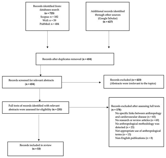 The Boolean operator AND was employed to refine the search. The keywords used in the search were as follows: “medical anthropology” AND “cardiovascular disease*”; “medical anthropology” AND “heart”; “medical anthropology” AND vascular; “medical anthropology” AND “vein*”; “medical anthropology” AND “artery”; “medical anthropology” AND “wound*”; “medical anthropology” AND “venous”; “medical anthropology” AND “arterial”; “medical anthropology” AND “blood pressure”. The symbol * represents any number of characters, even zero.