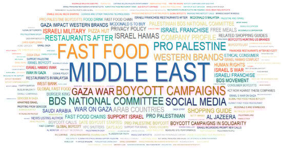 This study examines global fast-food chains for salient reasons. Fast-food restaurants occupy international positions that reflect Western power and economic developments and exist as prominent multinational corporations [12]. The symbolic nature of international fast-food restaurants makes them popular targets when consumer activists choose to take action, particularly during times of heightened political and social conflict. The fast-food sector has faced a major boycott movement due to its involvement in the Israeli–Palestinian conflict, according to Buheji and Ahmed [7] and Seyfi, Hall, et al. [40]. Additionally, boycotts targeting the fast-food industry have been organized through websites and social media by boycott movements, and as a result, some investments in conflict zones have been dismantled and sanctions imposed [23].