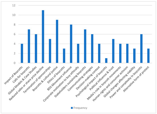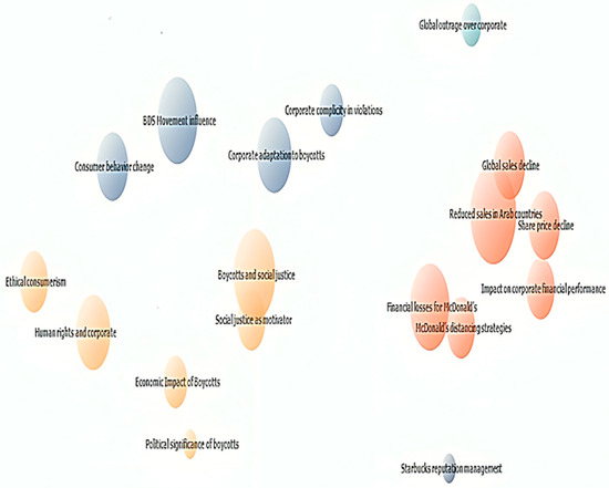 To address the study’s aims, the interpretation of data was performed based on the thematic analysis to provide a comprehensive assessment frame, which involved the identification of themes in the data, the analysis of the themes, and then the reporting of the analysis to explore complex social consumer boycott phenomena, where the content analysis was carried out to explore latent meanings and patterns in the data [71]. Thus, it was relevant for the investigation of power dynamics and narratives embedded within the discourse of the boycott because it examined the values, beliefs, and arguments that drive consumer activism [72]. Moreover, its ability to take into consideration a vast amount of web-based material of consumer responses, media coverage, and company responses allowed us to develop an understanding of the intricate boycott effects [73].