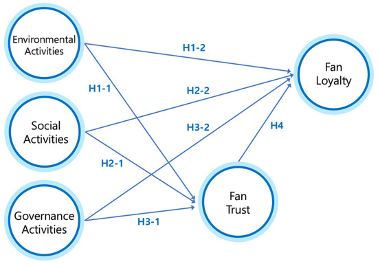 Based on the works of Homans [16] and Blau [17], social exchange theory (SET) is one of the most well-known paradigms in the social sciences, which views social relationships as exchanges of resources between individuals. SET proposes that people form and maintain relationships as a series of interconnected acts wherein they perceive that they gain more than they lose [18,19]. Although SET was initially used to explain individual behavior, it has been expanded to explain exchanges between groups, organizations, and other entities as well as the processes and effects of such exchanges [20]. At the core of SET is the idea that trust and commitment are outcomes of this exchange process, which are developed through reliable and rewarding interactions [21]. Over time, the theory has been extended and applied to various domains, including workplace behavior, organizational justice, and, more recently, corporate social responsibility (CSR) [22,23]. For the purposes of this study, SET is particularly suitable for understanding how the ESG activities of professional sports clubs can affect fans’ trust and loyalty because, through its lens, ESG activities can be viewed as an exchange process through which clubs offer social and environmental value to elicit trust and loyalty from fans.