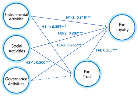 We employed structural equation modeling (SEM) to explore the proposed relationships. All indicators evaluating the model’s fit indicated its adequacy (χ2/df = 2.712, NFI = 0.928, IFI = 0.915, TLI = 0.911, CFI = 0.924, RMSEA = 0.076) [65]. This model formed the foundation for evaluating Hypotheses 1-1, 1-2, 2-1, 2-2, 3-1, 3-2, and 4. As illustrated in Figure 3, our study establishes a statistically significant relationship between environmental activities and fan trust (H1-1) with a coefficient of 0.397 (p < 0.001). H1-2 is also affirmed, as our results indicate a significant and positive relationship between environmental activities and fan loyalty with a coefficient of 0.318 (p < 0.001). Additionally, consistent with H2-1, we identified a significant relationship between social activities and fan trust, with a coefficient of 0.500 (p < 0.001). H2-2 is also confirmed, as social activities exhibit a significant and positive relationship with fan loyalty (coefficient of 0.292, p < 0.001). While a significant relationship is observed between governance activities and fan trust (0.268, p < 0.001), thereby supporting H3-1, governance activities were not found to have a significant positive impact on fan loyalty, so this finding rejects H3-2. Lastly, fan trust has a significant impact on fan loyalty (coefficient of 265, p < 0.001), which supports H4.