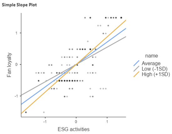 As predicted in H5-2, both ESG activities (Z = 21.05, p < 0.001) and fan citizenship (Z = 5.36, p < 0.001) were found to significantly impact fan loyalty. Their interaction (Z = 2.09, p < 0.05) also demonstrates a significant effect on fan loyalty, which supports H5-2 (see Table 3). The independent variable, the moderator variable, and their interaction all display positive signs, indicating the presence of an enhancing effect. Consequently, we conducted a simple slope analysis to examine the variations in the slope between the independent and dependent variables based on the moderating variable, categorizing it into three levels: low (mean −1SD), average, and high social support (mean +1SD). The results are presented in Table 3. The analysis revealed that within all three groups (average, low, and high social support), the fan citizenship variable significantly influenced fan loyalty (Z = 20.4, p < 0.001; Z = 10.5, p < 0.001; Z = 24.5, p < 0.001).