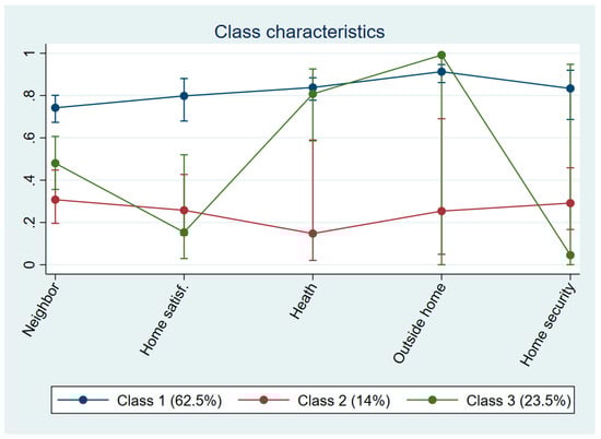 To summarise, the three identified classes follow a conceptual structure, with the first and second clusters representing markedly different types of individuals. The first group is associated with above-average values, while the second cluster includes individuals who scored lowest on neighbourhood satisfaction, home satisfaction, perceived health, time spent away from home, and perceived housing security. The third cluster lies between the first two, achieving intermediate values across the indicators. This study will concentrate on comparing the first and second clusters.
