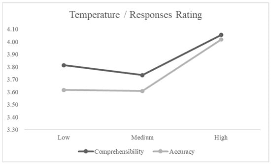 The descriptive statistics on the AI response quality confirm a well-known trend in language models: responses were generally perceived as more comprehensible than accurate. Moreover, as illustrated in the graph presented later, the temperature setting appears to have had a positive effect on the quality scores at the highest level (Table 3).