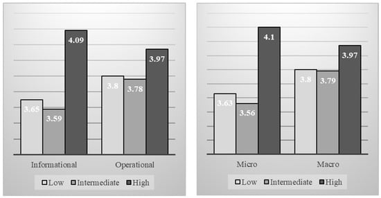When considering the three temperature levels, a nearly identical trend was observed for both dimensions. At the low and medium levels, there were no significant differences, but at the high temperature setting, both scores rose sharply. Increasing the creativity parameter thus appeared to positively affect the overall quality of the content (Figure 2). When examining the different prompt contexts, the substance of the trend remained largely unchanged. Whether the prompts were informational and micro in nature, or operational and macro, a clear positive shift occurred when the temperature was set to the highest level. However, the effect was less pronounced in the operational and macro prompts, even though these tended to produce responses that were, overall, rated more favorably (Figure 3).