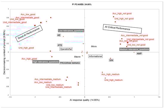 To identify the most relevant variables that contributed to latent factors, the V-test was employed, which allowed for the detection of categories with statistically significant contributions. The MCA revealed two principal axes: the first was associated with the quality and stability of the AI-generated responses, and the second was linked to the decision-making context and prompt relevance.