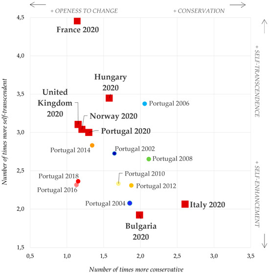 France strongly emphasized Self-Transcendence among the compared countries in 2020, with scores more than 4.5 times higher than Self-Enhancement. Bulgaria presented a contrasting case, with a ratio of only 1.9 times. Interestingly, Portugal’s value distribution in 2020 diverged from Italy’s, a country with similar Catholic-Mediterranean roots. Italian society appeared more conservative and focused on Self-Enhancement compared to Portugal.