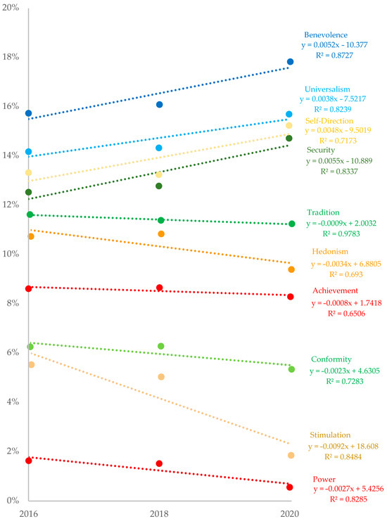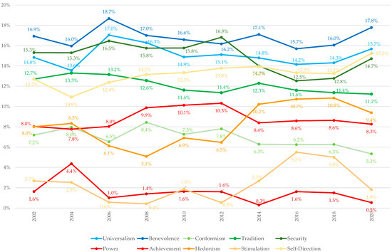 At the same time, the strengthening of Universalism, Benevolence, and Security suggests a broader recalibration of societal priorities toward collective well-being, tolerance, and stability. These shifts likely result from the interplay of global and national phenomena, such as the pandemic crisis [13,15], ongoing globalization pressures, and the sociocultural implications of growing immigration [6]. The pattern confirms that periods of external stress tend to amplify the need for security and reinforce prosocial orientations [23,24,48]. Notably, the decline in Conformity to its lowest historical level in 2020 (Figure 3, Table 2), coupled with the rise of Self-Direction, points to a growing questioning of traditional norms and a possible future intensification of societal tensions or adaptations [9,10].