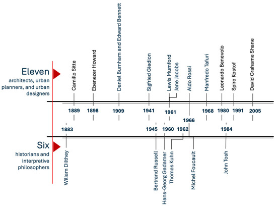 Figure 1. Seventeen key insights from historians, interpretive philosophers, and urban specialists. The dates indicate when each work was first published. Source: The authors from the history and philosophy literature [9,11,12,33,34,35] and architecture and urban design literature [15,16,17,29,30,34,36,37,38,39,40].