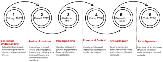 This subsection examines the contributions of six historians and interpretive philosophers, focusing on how various methodological approaches—such as hermeneutics, paradigm analysis, and critical historiography—illuminate the interplay between historical systems of meaning, power structures, and textual interpretation. These methodologies serve as crucial frameworks for understanding how texts are influenced by and respond to their historical contexts, as illustrated in Figure 3 (refer also to Table S3 in File S2 of Supplementary Materials).