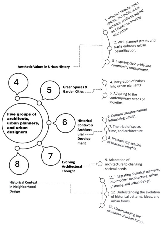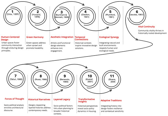 The findings of these contributions highlight the critical role of historical inquiry, which shapes two types of analytical and critical historical thinking: theoretical perspectives and practical applications within these fields. This subsection explores the contributions of eleven specialists in architecture, urban planning, and urban design. These eleven specialists conceptualize the architectural and urban forms of the cities as “living historical texts” intricately linked to human experience and cultural memory. Figure 4 illustrates how historical moments, societal transformations, and cultural traditions have shaped their approaches, influencing both theoretical frameworks and practical methodologies (see Table S4 in File S2 of the Supplementary Materials).
