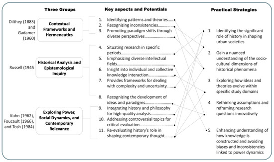 This subsection highlights the significance and contributions of historians’ and interpretive philosophers’ findings in two systematic efforts. First, the findings of relevance emphasize the importance of understanding historical texts as products of their specific contexts, dynamically shaped by social, cultural, and political factors. Scholars such as Wilhelm Dilthey [9], Bertrand Russell [33], Hans-Georg Gadamer [34], Thomas Kuhn [11], Michel Foucault [35], and John Tosh [12] have significantly advanced our understanding of how historical analysis influences knowledge creation across the social sciences, humanities, and urban studies. Second, based on the findings from the examination of specific literary works, it is clear that their contributions offer an innovative perspective for critically engaging with contemporary knowledge and situating it within the broader context of intellectual traditions.