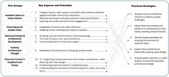 Six pivotal themes offer practical strategies from leading scholars: the role of history, historical phenomena, paradigm shifts and changes, transformative analysis, and the dynamics of power and authority. These themes illustrate how engaging with historical context can enhance both theoretical and practical perspectives in architecture, urban planning, and urban design. The extracted strategies are summarized in five practical strategies (Figure 8 and Table S6 in File S3 of the Supplementary Materials).