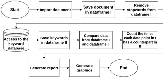 Workflow for keyword analysis in the proposed document processing framework. The diagram outlines the systematic method to quantify predefined keywords in textual data, consisting of the following steps: (1) Importing documents into a structured dataframe; (2) Removing stopwords to isolate meaningful terms; (3) Cross-referencing terms with a predefined keyword database; (4) Counting keyword matches to assess relevance; (5) Generating analytical reports and visualizations.