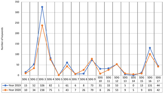 Figure 3 illustrates an impact analysis of the 2030 agenda, showing the general variation in the number of identified keywords. An increase in words can be noticed related to SDG 8 and a reduction in SDG 10, regardless of the area of knowledge. Such results allow for an initial interpretation regarding SDG 3 (Health and Well-being), specifically the reduction in projects in the areas of Biological Sciences and Health in 2020, which directly impacted the overall results on the subject. Still, subsequently, one search to relate each SDG to different areas of knowledge.