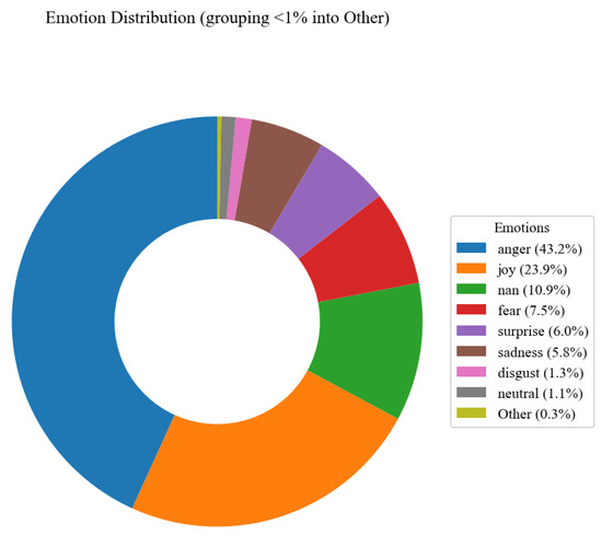 The emotion distribution in the comments (see Figure 1) reveals a predominance of negative sentiments, with anger being the most prevalent emotion at 43.21%. This is followed by joy at 23.92%, indicating a substantial yet secondary presence of positive emotion. A notable portion of the comments, 10.90%, falls under the unknown category, suggesting limitations in emotion detection or ambiguous expressions. Other emotions such as fear (7.46%), surprise (6.01%), and sadness (5.80%) are also present, reflecting a mix of emotional responses. Less frequently observed are disgust (1.26%) and neutral (1.12%) tones. Remaining emotions, which comprise 0.32%, are labeled as other.