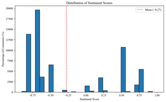 The sentiment score analysis (see Figure 2) indicates an overall negative tone in the comments. The mean sentiment score is −0.274, and the median is even lower at −0.600, suggesting that more than half of the comments lean significantly negative. The standard deviation of 0.592 reflects a moderate spread in sentiment values. A skewness of 0.729 points to a right-skewed distribution, meaning that while most comments are negative, there are some more positive outliers. The kurtosis of −1.206 indicates a flatter distribution than a normal curve, with fewer extreme values and a broader spread around the mean.