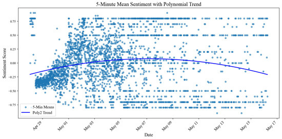 The sentiment trend over time reveals a temporary improvement in the overall tone of comments, followed by a return to negativity (see Figure 3). From 28 April (−0.203) to 7 May (0.077), sentiment scores gradually shifted into positive territory, suggesting a short-lived period of optimism or reduced negativity. However, this trend reversed after 7 May, with sentiment steadily declining to −0.206 by 16 May. Despite these fluctuations, the net change over the entire period is minimal (−0.003), indicating that the overall sentiment remained consistently negative, with only a brief interruption in tone.