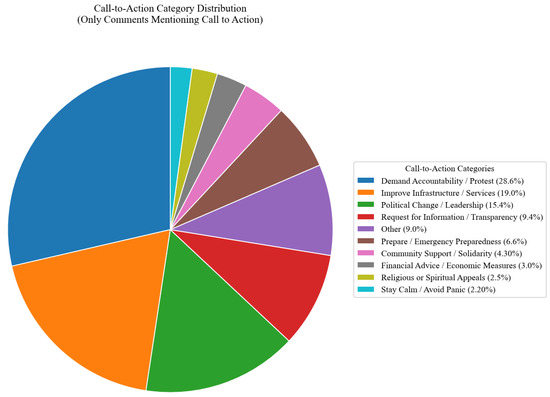 Among the comments that include a call to action (20.3% of all comments), the most common appeal is to demand accountability or protest, accounting for 28.6%, reflecting strong public frustration and a desire for institutional responsibility (see Figure 4). This is followed by calls to improve infrastructure or services (19.0%) and political change or leadership reform (15.4%), indicating a clear focus on both systemic failures and political dissatisfaction. Other frequently mentioned categories include requests for information or transparency (9.4%) and preparedness or emergency planning (6.6%), showing a mix of reactive and proactive concerns. Less common but still present are calls for community support or solidarity (4.3%), financial advice or economic measures (3.0%), and religious or spiritual appeals (2.5%). A small portion (2.2%) encourage the public to stay calm or avoid panic, while 9.0% fall under other, capturing varied or ambiguous actions.