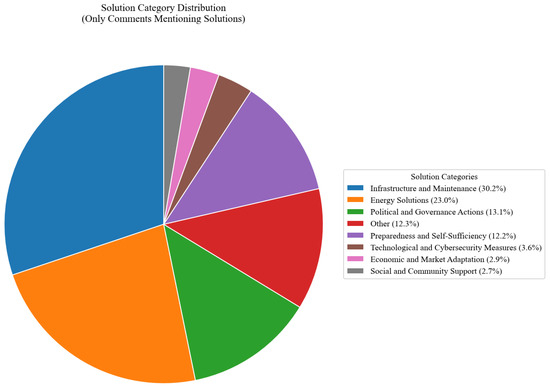 Only 10.1% of comments offer a solution, indicating that the vast majority (89.9%) focus on expressing opinions, emotions, or identifying problems without suggesting a way forward. Among the comments that offer solutions (see Figure 5), the most common suggestions focus on infrastructure and maintenance (30.2%), highlighting a strong demand for improvements to physical systems and long-term reliability. Energy solutions follow at 23.0%, reflecting calls for alternative energy sources or better energy management. Political and governance actions account for 13.1%, showing that some users advocate for institutional reform or policy intervention. Preparedness and self-sufficiency (12.2%) suggest that a portion of users emphasize individual or community resilience. Other solution types include technological and cybersecurity measures (3.6%), economic and market adaptation (2.9%), and social and community support (2.7%), each representing smaller but still meaningful segments. Other solutions make up 12.3%, capturing suggestions that do not fit neatly into a single category.