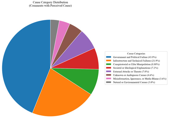 Out of all comments, 53.8% include a perceived cause, indicating that over half of users explicitly attributed the event to a specific origin. Among these (see Figure 6), the most common attribution is to government and political failure at 43.9%, reflecting a widespread perception of institutional blame and dissatisfaction with leadership or policy. Infrastructure and technical failures are cited in 21.9% of these comments pointing to concerns about the reliability and maintenance of systems. Other notable categories include conspiratorial or elite manipulation (8.8%), societal or ideological explanations (7.2%), and external attacks or threats (7.0%), revealing a mix of speculative and security-related interpretations. Less frequently mentioned are misinformation or media blame (3.6%) and natural or environmental causes (3.0%), while other causes make up 4.6%.