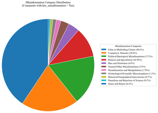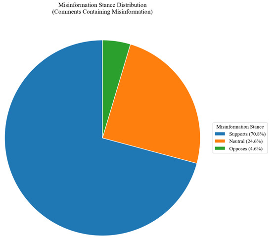 Among all comments, 46.1% are flagged as containing misinformation, indicating that nearly half of the discourse includes or engages with misleading or false content (to assess the validity of GPT-4o-mini’s classifications, 100 comments flagged as misinformation-related were randomly selected and manually reviewed. Of these, 86 were clearly identifiable as misinformation, while the remaining comments included context-dependent cases and some apparent false positives. Given the large volume of data, full manual classification was not feasible, and the study relied primarily on the model’s automated identification). The most prevalent type (see Figure 7) is false or misleading claims (40.6%), followed by conspiracy theories (20.0%) and political/ideological misinformation (17.5%), highlighting the dominance of narratives rooted in distortion, speculation, and politically charged content. Additional categories include rumors and speculation (10.5%) as well as bias and distortion (4.0%). Disinformation and manipulation, scientific misconceptions, inaccuracies, denialism, and satire/humor have lower shares. Most misinformation-labeled comments support the false or misleading content (70.8%), while 24.6% take a neutral stance without clear agreement or opposition (see Figure 8). Only 4.6% explicitly oppose it.