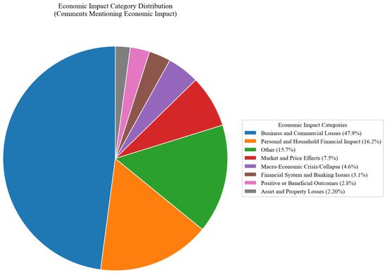 Among the comments that discuss economic impact (7.4%), nearly half (47.9%) focus on business and commercial losses, emphasizing concerns about disruptions to operations, lost revenue, and economic activity (see Figure 9). Personal and household financial impacts are the second most common theme (16.2%), highlighting the strain on individuals and families. Other notable categories include market and price effects (7.5%), such as inflation or supply shortages, and macro-economic crisis or collapse (4.6%), reflecting broader economic fears. Smaller proportions of comments mention financial system and banking issues (3.1%), asset and property losses (2.2%), and even positive or beneficial outcomes (2.8%), suggesting that a few users perceived potential advantages or long-term improvements. An additional 15.7% fall into the other category, capturing economic concerns that are not clearly classifiable.