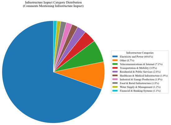 Out of all comments, 23.6% mention a specific infrastructure impact, highlighting that nearly one in four users engaged with the topic in terms of disrupted systems or services. Most of these references (69.6%) concern electricity and power, reflecting the central role of power outages in public discourse (see Figure 10). Other infrastructure categories are mentioned far less frequently, including telecommunications and internet (7.1%), transportation and mobility (3.9%), residential and public services (2.8%), healthcare and medical infrastructure (1.9%), industrial and energy production (1.9%), food and retail infrastructure (1.8%), water supply and management (1.2%), and financial and banking systems (1.1%). An additional 8.7% of mentions fall under other, capturing less clearly defined or miscellaneous infrastructure concerns.