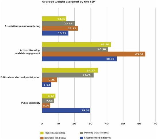 Figure 1 and Table 2 present the main results of the analysis according to the conceptual dimensions of participation, based on the work of the TEP. Figure 1 presents the average weight assigned by the panel to the challenges that the expert group itself identified in the first phase of the fieldwork. The results were segmented according to the four basic dimensions considered: associations and volunteering, active citizenship and civic engagement, electoral political participation, and finally, public sociability. Table 2 contains a similar analysis, but this time segmented according to the lines defined to generate and assess the participation items by the TEP: problems identified, defining characteristics, desirable conditions, and recommended initiatives.