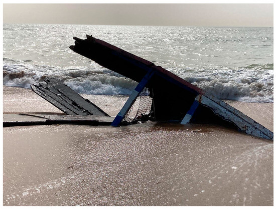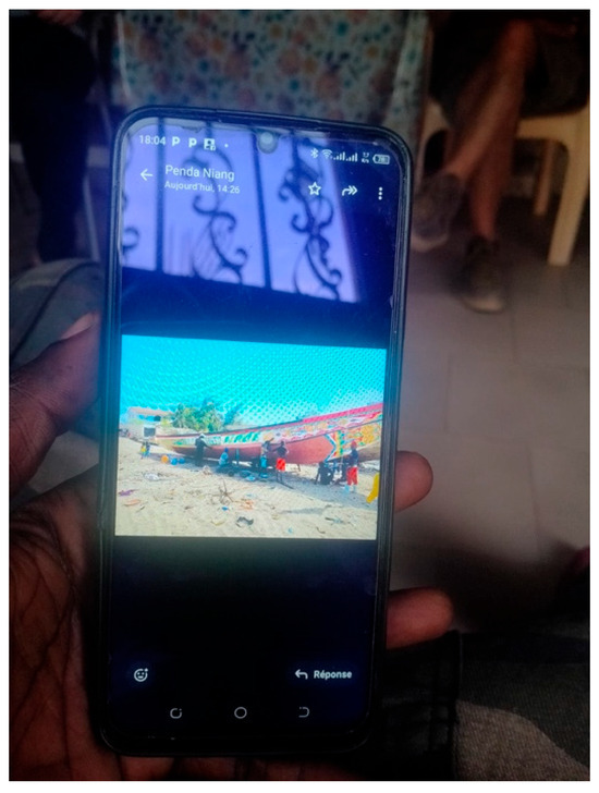 Joal is another departure point along the coast moving southward, one hour’s drive from Mbour. It is a fishing village, like so many others: like so many others in crisis because of the crisis of artisanal fishing [43]. Many families of the village are involved in the story of a missing pirogue that left on 30 April 2024 with 125 passengers onboard (Figure 3); many passengers were local, others came from Casamance, Ghana, or Gambia. We speculate that this one was also a family pirogue of neighbors and acquaintances, with a share of strangers paying to cover the initial expenses: a mixed pirogue. We meet a woman whose brother disappeared. She tells us almost nothing; she does not want her story recorded. She works in fish sales, and her brother was a fisherman. We only learn that poverty has increased as a consequence of the missing pirogue and, once again, weighs on those left behind: women and children. Those who had to leave to support their families from abroad are no longer there; in this sense, the difference between dying and disappearing, in terms of the family economy, is irrelevant.