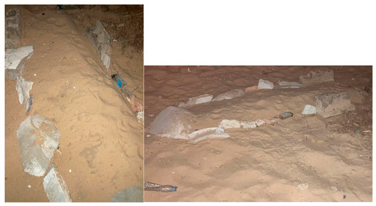Actually, even the location of the washed-up wreck was a surprise to us due to a slight misunderstanding. We had erroneously understood that the boat was found in front of Mbour near the hotel where we were staying, where the sea had returned several unidentified corpses that were then buried overnight and anonymously, with a few stones scattered around the beach to cover and signal the presence of bodies without names (Figure 2). People say there are other hidden and anonymous graves all around—more corpses, more dead—but we just saw the two nearby, at night, in the dark amidst the brambles, having been driven there by two kids we encountered in front of the hotel. We thought that the pirogue had followed the same trajectory.