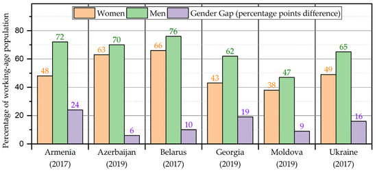 Some other clear initiatives financed by the EU that support this goal, even if indirectly, include the Statistics Through Eastern Partnership (STEP) programme, implemented throughout the 2019–2022 time period, with a cost of EUR 4.7 million, which represented the first regional statistics initiative in the Eastern Neighbourhood region. Among the 16 projects under STEP, there was also gender statistics, which focused on improving the availability of sex and gender related data in multiple fields while also highlighting the importance of accessible, high-quality data for establishing policy priorities and enabling national and regional comparisons to be made. One such finding was related to gender gaps in the labour market where women were found to be less likely to have a job or to seek one, compared to men, with the highest discrepancies being recorded in Armenia with a gender gap of 24%, while the lowest can be found in Azerbaijan with a 6% difference (see Figure 1) [33].
