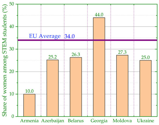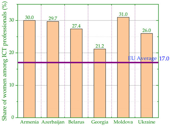 Women’s participation in STEM and ICT-related jobs specifically has been highlighted as a crucial element in achieving the key goal of resilient digital transformation as part of the EU’s digital strategy for sustainable growth. The main issues identified in achieving gender equality for fulfilling this goal in the six EaP countries were gaps in digital literacy, the significant under-representation of women among STEM students (26.3% on average, see Figure 2) and professionals (27.6% on average, see Figure 3), their limited representation in ICT businesses and decision-making on digital transformation, and online discrimination and cyber violence [34].