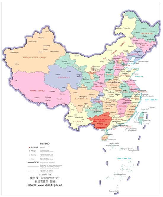The location of Guangxi Zhuang Ethnic Autonomous Region (in dark red color) in the map of China. Other colors are only meant to differentiate provincial boundaries.