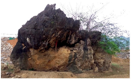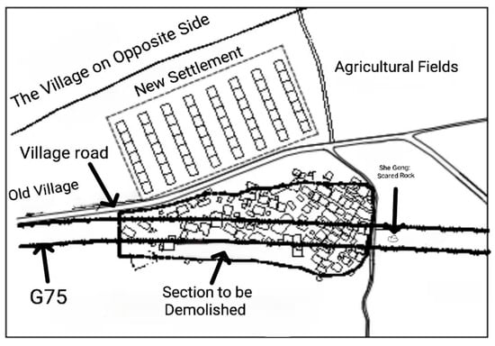 In Huang village, 98% of the residents are of the Zhuang ethnicity. The Zhuang residents in the village have four designated Sacred Rocks, located in the four corners of the village. The Sacred Rock that was in the southeast corner of the village happened to be “in the way” of the G75 Highway (See Figure 2 for its image). To push the highway forward, the local government believed that it had to be removed by explosives. According to the villager Mr. Huang, this Sacred Rock has been designated “Sacred” for over 200 years by villagers. The name of the Sacred Rock is “She Gong”; its literal translation is “Community Deity”. In Zhuang culture, a rock that is shaped straight upright or like a human body is often selected as a community deity [35]. It is believed to protect the Zhuang people in the village by driving away demons. On major memorial days, such as Cleansing Day on February 7 in the Lunar calendar, when people go to visit their deceased relatives; March 3, when villagers celebrate the coming of the spring; and every Chinese New Year, when villagers celebrate the renewal of life, all villagers would bring sacrificial goods to pray for protection from the Sacred Rocks. Sacred Rocks are believed to provide good fengshui or geomancy for the villagers.