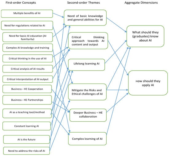 The data were analyzed using Gioia’s methodology, which facilitated a structured identification of first-order concepts, second-order themes, and aggregate dimensions. This analytical framework enabled a nuanced understanding of business expectations regarding the role of HE institutions in preparing graduates who are capable of meeting economic and commercial imperatives under the pressure of AI diffusion. Gioia methodology facilitated the identification of how business expectations resonate with the theoretical constructs presented in the first part of the article: Firms emphasized not only the need for basic AI knowledge (linked to the Technology Acceptance Model (TAM)) but also the capacity for critical and ethical judgment (linked to Social Cognitive Theory). Thus, the research questions and emergent themes are directly anchored in—and extend—the theoretical background laid out in the early sections. The paper ends with conclusions, limitations of the study, and future research avenues.