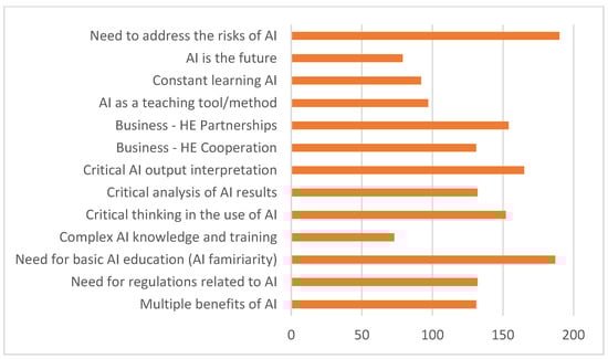 “Lifelong learning AI” grouped codes as AI as a teaching tool/method, Constant learning AI, AI is the future. Business representatives expressed, in different ways, that universities need to foster a mindset in graduates that recognizes we are at the start of a rapidly evolving era, marked by the growing influence of new technologies in both everyday life and traditional business practices. Cultivating habits of continuous learning, sustained exposure to AI, and practical experience in its application is essential for universities moving forward: “we need to learn constantly about the new technologies, as they develop faster and faster” (FN).