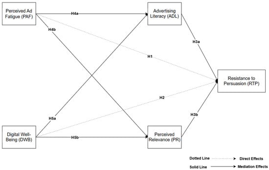 In light of this, the current research situates digital well-being (DWB) as an antecedent and advertising literacy (ADL) as a psychological process that mediates users’ reactions to highly personalized ads. Based on self-regulation theory, the Persuasion Knowledge Model (PKM), and coping/resilience theories, we propose that higher DWB individuals will acquire more advertising literacy, and it is this that determines whether or not exposure to electronic persuasion leads to passive fatigue or active resistance [25,26]. This terminology lends itself to broader media literacy and digital mental health conversation in naming the co-priority of encouraging both emotional regulation and critical awareness in users’ experience of algorithmically curated content.