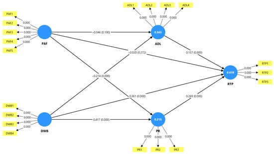 PLS-SEM structural results. Blue nodes are latent constructs—perceived ad fatigue (PAF), digital well-being (DWB), advertising literacy (ADL), perceived relevance (PR), and resistance to persuasion (RTP); yellow rectangles are reflective indicators. Numbers on arrows are standardized path coefficients (β), with bootstrapped p-values in parentheses; numbers inside endogenous nodes are R2.