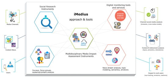 Today, Artificial Intelligence (AI) and digital platforms are rapidly transforming the media landscape, affecting personal, societal, and professional activities [,]. In this context, various aspects of news production and consumption are considered, with the aim of identifying new opportunities for creating, validating, disseminating, and evaluating accurate, impactful, and engaging journalistic content. In this context, innovative processes and automations are incorporated while enhancing journalists’ literacy and awareness of new capabilities [,,,,,,,]. Hence, the scientific field of journalism and media studies seeks new methods to assess the impact of media informational streams on the audiences in qualitative and quantitative terms. The iMedius framework1 (integrating multidisciplinary media impact assessment instruments) introduces an innovative multidisciplinary integration of tools that bring together research instruments from the social sciences and multimodal analysis methods from the digital world [].