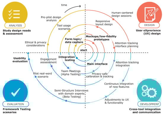 Following the flow of the spiral model, the flexible layout design of the form elements and the attention-tracking interface design are gradually developed and integrated within the adopted modular architecture. In particular, the development of the modules and the integration of attention tracking with its calibration and the materialization of the privacy-safe monitoring mechanisms are carried out, along with a constant incorporation and elaboration of new optimization features. Additional development considerations and features (not in the core of the current work) include the iMedius Browser Extension and the Social Media Monitoring Toolbox, both of which are complementary modules to enhance digital behavioral data collection. New features and functional updates are selected after intensive and iterative design validation meetings to make the necessary UX adjustments and optimize functionality. The outer helix involves the pilot testing of the application with the configuration of a real-world use case scenario. As already noted, the selected pilot analyzes the impact of tampered images on users visually inspecting the content while also utilizing algorithm-assisted tools, pursuing insightful perception assessment through attention tracking. In fact, the specific scenario emanated from previous news authentication research, evaluating the photo-truth impact through image verification algorithms [], which actually gave birth to the attention monitoring idea and the iMedius concept. According to the adopted model and the associated process flow of Figure 2, formative evaluation is an integral part of all iterative design cycles, leading to improvements and optimizations [,,,,]. However, it is worth highlighting the two final evaluation sessions indicated to follow the platform implementation. The first refers to the integration testing and usability assessment planned to be carried out within the iMedius research team (Alpha testing), in project meetings and dedicated focus groups (as further explained in [] for the usability evaluation sub-case). The second seeks to receive qualitative feedback by third parties outside the development team (Beta testing), involving domain experts who participated in the 2024 iMEdD International Journalism Forum, on the occasion of a related iMedius-driven workshop5,6.