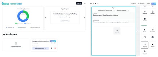 In terms of the platform’s collaborative nature, a “Share” option was introduced. This feature enables co-researchers to collaborate on constructing things, allowing multiple users to share and work on forms simultaneously. It makes it easier for people to work together, share ideas, and make sure that multiple points of view are taken into account while designing and building the tools, thus making the research process better and more effective. Finally, in addition to the primary form creation process, form templates were added to assist researchers in structuring their forms. In this context, there is the opportunity to broaden the template area with further options as the project progresses and additional effective, validated, and engaging surveys are developed. Some of the points discussed above, including the addition of the “Preview Mode” button, the capability to randomize the sequence of questions and pages, and the introduction of the “Share” feature for collaboration, have been thoroughly examined in a prior study focused in the areas of UX evaluation of the platform through a focus group with subject matter experts [].