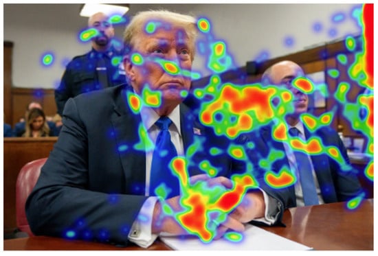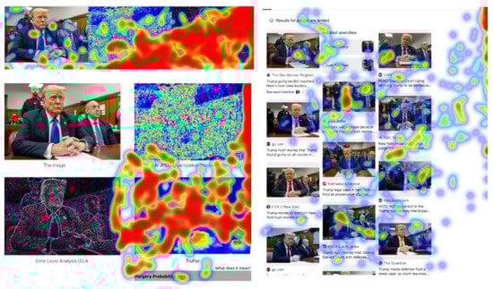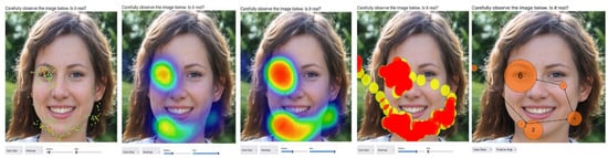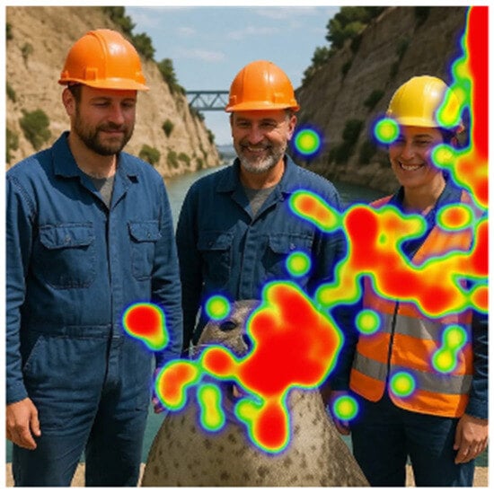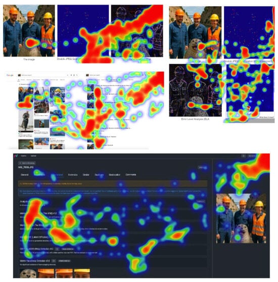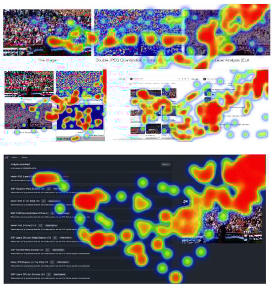 The subsequent phase of assessing the platform’s efficiency was to design and implement an experimental procedure using the iMedius environment as a data collection tool. The real-life scenario chosen was the verification of content (images) without and with the aid of image forensics applications. Hence, three different images were crafted, one authentic, one created with AI (AI-generated), and one digitally altered, to be exposed and evaluated by the participants (Figure 3). For each image, a series of evaluation steps take place, starting with simple observation and progressing to the use of specialized image analysis tools as color and probability maps (Image Verification Assistant) [], reverse search results and, where applicable, an AI-driven assessment estimating forgery probability (MeVer Media Annotation and Management Service–MAAM)7 []. At each step, participants are asked to state their evaluation of the image’s nature and justify their answer, while their attention is recorded using eye and mouse tracking. This approach allows researchers to extract data about the impact of the tools on their evaluation and cognitive processes, thus providing insightful views of performance, behavior, and visual strategy. The experiment builds on the methodology of a previously published scientific article [], with the primary objective of assessing people’s ability to recognize the nature of images with or without the use of digital forensics tools. The study focused on the impact of first-generation tools (Image Verification Assistant and Forensically), while it relied only on participants’ responses regarding the authenticity of the images. The present experiment adds attention tracking as a critical factor of analysis, to monitor where participants’ focus and if their behavior changes as the stages progress and new tools are introduced. Moreover, attention-tracking technology is not merely an observation tool but is integrated as a fundamental and structural element of the experimental process. At each stage of the experimental process, the areas on which participants focus are recorded. This detailed monitoring intends to investigate whether the technical tools influence the users’ visual patterns, i.e., whether they shifted their attention to critical or misleading areas of the image. At the same time, it is examined whether there is a correlation between the observation strategy followed by each participant and their final assessment of the nature of the image (authentic, AI genarated or digitally manipulated). Finally, attention tracking is also placed as a means of educational feedback, given that participants gradually become familiar with the use of verification tools through the interactive assessment experience.
