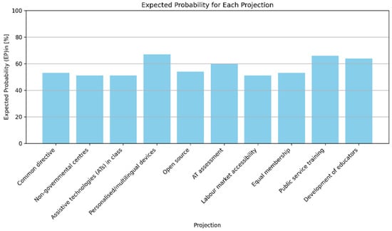 An essential element of a typical Delphi survey involves estimating the likelihood of specific scenarios occurring in the near future. In our study, these anticipated outcomes were associated with various dimensions of ATs, including education, society, service provision, employment and politics. All were considered within the context of the year 2030, offering valuable insights into emerging future trends in the use of ATs. As illustrated in Figure 1, all projections have an overall likelihood exceeding more or less 50%, which reflects a generally moderate optimism by Bulgarian stakeholders about their potential realization by 2030. In particular, projection 4, “By 2030, personalized/multilingual devices with Artificial Intelligence (AI) will have been developed so that vision-impaired people can read and generate written texts” and projection 9, “By 2030, there will be trainings for people in public services on how to address a person with Autism Spectrum Disorder (ASD)” have probabilities over 65%. This indicates that Bulgarian experts view multilingual and personalized devices as feasible and achievable by 2030. The stakeholders also expect growth in professional development opportunities within the public service and education field. Moderate probabilities for the other projections indicate ongoing uncertainties, highlighting the need for strong policy, training and inclusive design to achieve meaningful progress. The results are comparable to the ones of international Delphi research [19].