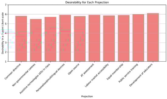 Regarding RQ2—“What trends are considered most desirable by experts on a national level in the field of ATs to support the social inclusion of people with disabilities?”—the study found that the projections were considered relatively desirable, especially the scenarios related to educator development and public service training. The overall consistency in desirability ratings across the participants indicates a shared recognition of the vital role ATs play for people with disabilities.
