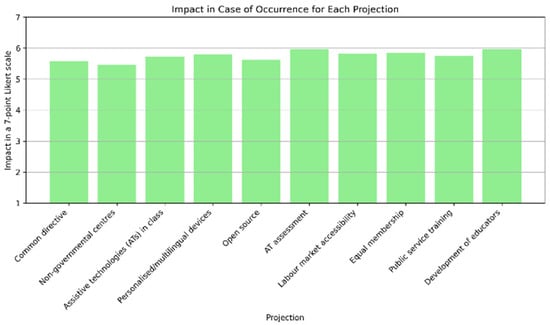 Figure 3 illustrates the likely medium-term impact of ATs in the proposed scenarios. The projections with the highest impact in case of occurrence (around six out of seven) are projection 6—“By 2030, service providers/practitioners will be able to conduct comprehensive assessments for appropriate AT according to the specific needs of people with disabilities” and projection 10—“By 2030, the use of ATs is included in the professional development of educators in mainstream schools”. The findings indicate that the experts believe it is crucial for practitioners to be able to perform evaluations to ensure appropriate ATs are matched to the relevant disabilities. According to the experts, ATs’ adoption depends not only on technology but also on the capacity of professionals to apply it appropriately. The specialists also think that educators should receive training to effectively use ATs. Generally speaking, the levels of impact are similar to those of desirability. This correlation indicates consistency that reinforces the respondents’ views on the potential benefits of ATs on the social inclusion and quality of life of people with disabilities. The findings highlight the importance of aligning technological advancement with the professional development of educators to fully realize the promise of assistive technologies.