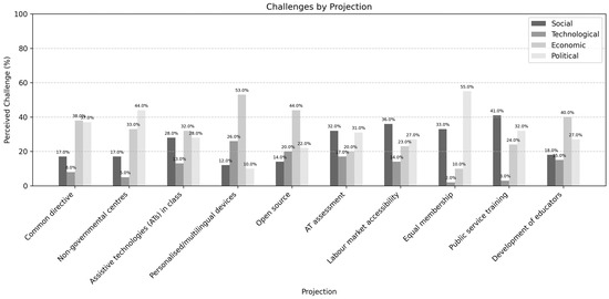 Another part of the current study examined potential challenges that might prevent the scenarios discussed in the ten projections from becoming a reality. These challenges were categorized as political, economic, technological and social. The economic challenges were viewed as the most essential barriers according to the respondents. They were the most prominent for projection 3—“By 2030, each European school has developed a methodology for using AT in class”, projection 4—“By 2030, personalized/multilingual devices with Artificial Intelligence (AI) will have been developed so that vision-impaired people can read and generate written texts”, projection 5—“By 2030, AT will be based on open source hardware and software making it accessible to users and caregivers” and projection 10—“By 2030, the use of ATs is included in the professional development of educators in mainstream schools”. The findings suggest that factors such as high costs, economic instability and unequal resource allocation could impact the development and distribution of ATs in different contexts. Economic issues were the most significant ones in the international Delphi study as well [19]. Political challenges are the next most frequent challenges. This means that political cooperation is essential for the realization of the scenarios outlined in the projections. Technological challenges were seen as the least significant across most of the projections, indicating that while technology is not a major barrier, success will depend heavily on sustained funding, policy alignment and societal engagement. The results are summarized in Figure 4 below.