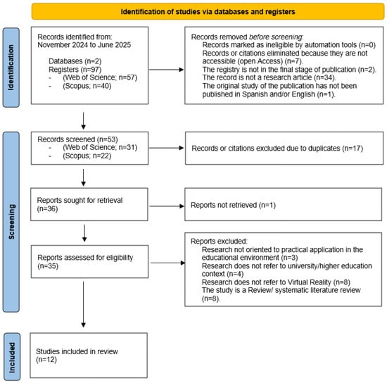 The search was restricted to the 2020–2025 period to ensure relevance and timeliness of the evidence. This decision responds to the rapid evolution of VR technologies and their pedagogical applications, which have advanced significantly in recent years. Limiting the timeframe makes it possible to capture contemporary methodological approaches and implementations closely aligned with current higher education practices and the SDGs while avoiding the inclusion of outdated studies that do not reflect the present state of the field.